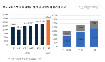 부동산 플랫폼 직방이 국토교통부 실거래가 자료를 분석한 결과 지난 1월 전국 오피스텔 거래량(개인 거래 기준)은 3,366건으로 지난해 같은 달 대비 65.6% 늘었다.