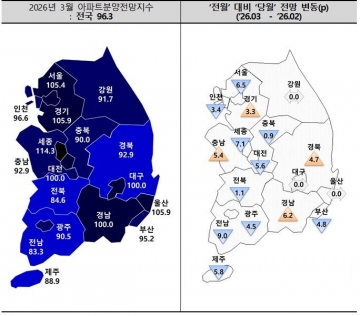 수도권은 서울이 6.5p(111.9→105.4), 인천이 3.4p(100.07→96.6) 하락 전망됐으며 경기는 3.3p(102.6→105.9) 등 상승 전망됐다.